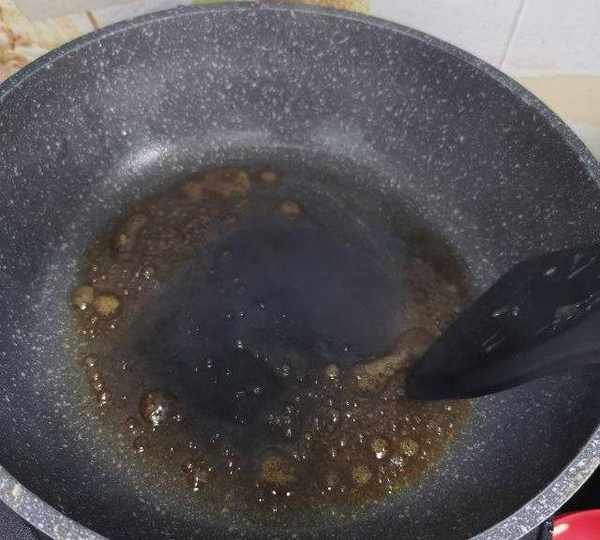 第5步、鍋中加少量色拉油,放入冰糖開始熬糖色,一定要小鍋慢慢熬,用勺子不斷的攪拌,剛開始糖溶化後是白色的大泡末,繼續煸炒由大泡變成小泡末,色澤也由淺黃色變成琥珀色。