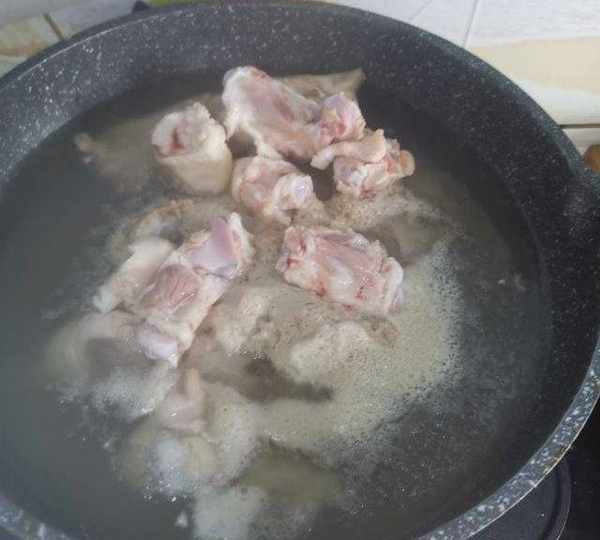 第2步、冷水下鍋,加入適量料酒,水開撇去浮末,繼續焯水2分鐘。