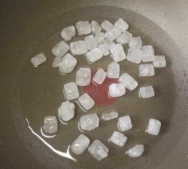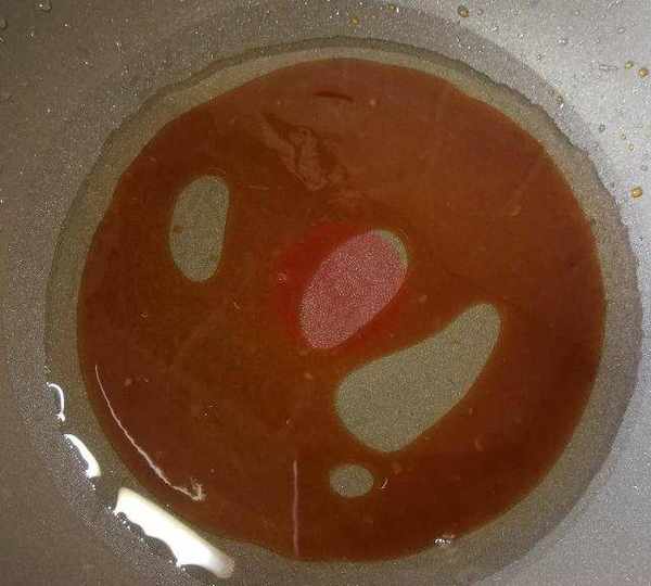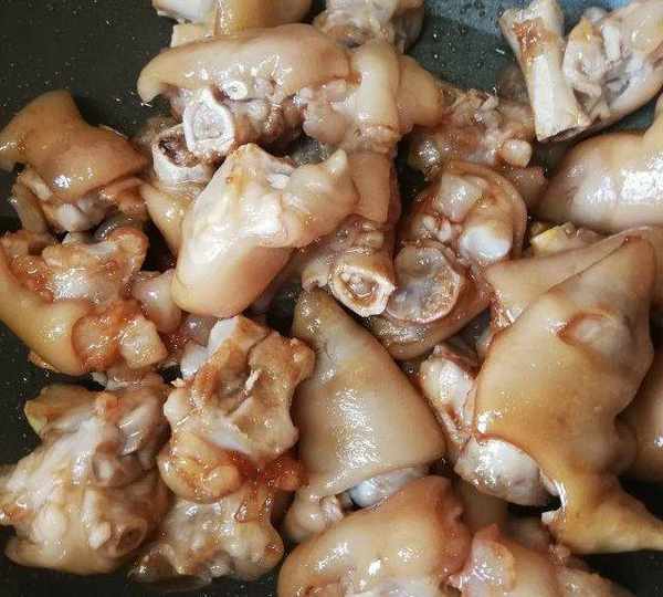 第10步、翻炒均勻掛上糖色。糖色遇涼,有的會凝結,沒關系,繼續翻炒,直至豬蹄上岀現漂亮的糖色。