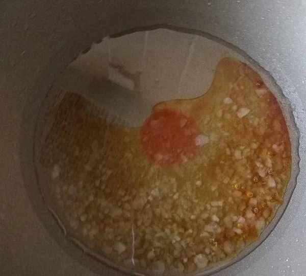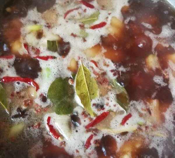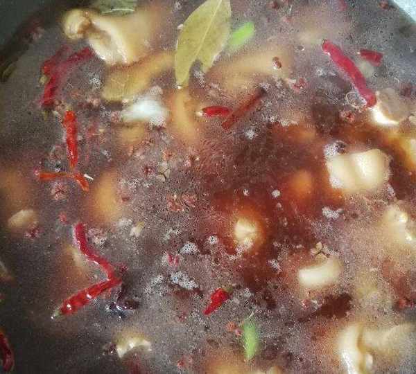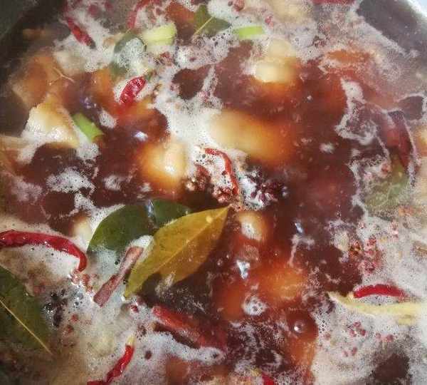 第11步、倒入蔥薑,花椒,八角,桂皮,香葉,幹紅辣椒。