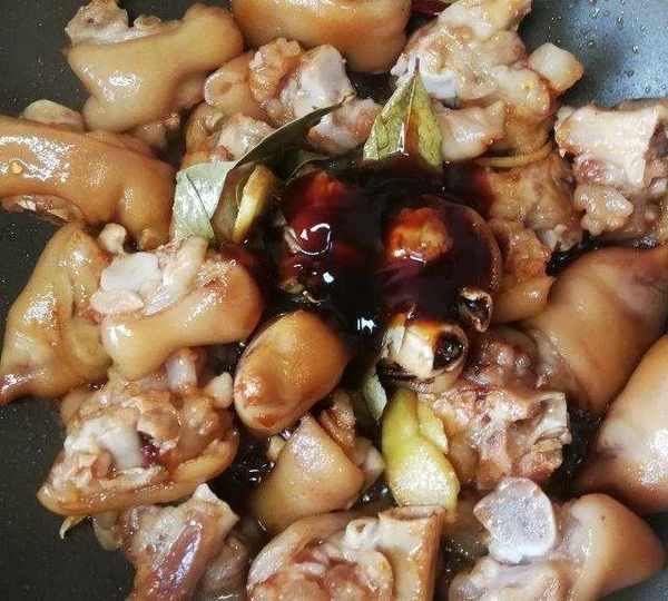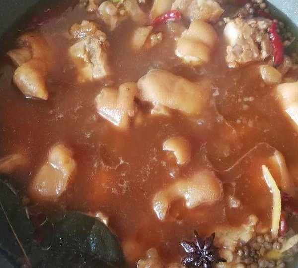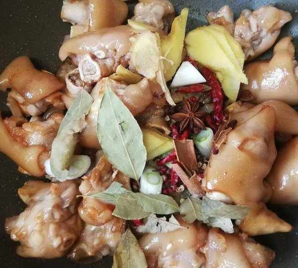 原料:豬前蹄、蔥、花椒、八角、桂皮、香葉、幹紅辣椒、玉米油、冰糖、生抽、老抽、蠔油、鹽、香蔥段、薑。