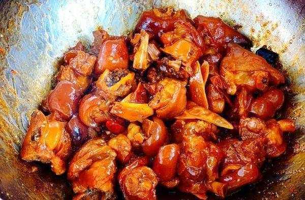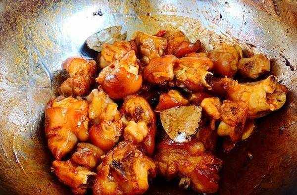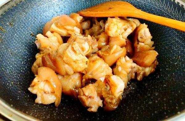 5.出現焦糖色後馬上放入豬蹄,快速翻炒均勻