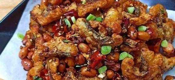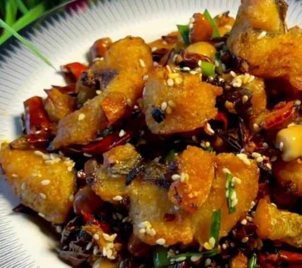 鍋留底油放入蔥末,薑末,蒜末,小茴香,八角,香葉,幹辣椒,花椒,小火炒出香味,加一勺辣椒面和一勺老幹媽炒出紅油,放入炸好的魚塊,加白糖,味精,雞精,生抽,十三香調味,噴上料酒,大火翻炒入味,加入花生米,白芝麻,花生油,辣椒油,翻炒均勻,灑上小蔥段即可出鍋