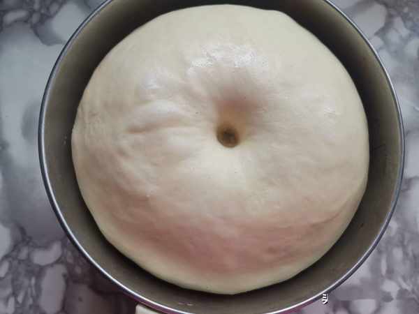 第二步:把揉好的麵團放到盆裏,蓋上保鮮膜,靜置發酵成兩倍大,用手指戳一個洞,不塌陷就是發酵好了。