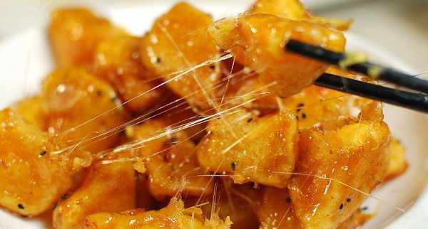 糖水已經開始變得濃稠瞭,大傢繼續攪拌一下,糖水開始變成麻油色關火,把紅薯倒進來,翻炒一下,把紅薯抓入碗中,是拔絲非常的漂亮。紅薯這樣做比紅薯餅好吃,軟糯脆爽,上桌就搶光,2個紅薯不夠吃。