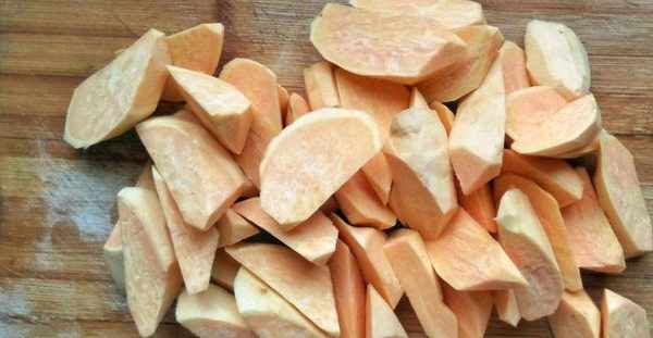 今天我們用兩個紅薯來跟大傢分享一個紅薯的新做法,下面我們開始制作。把紅薯坑坑窪窪的地方用刀給先削一下,然後再去掉皮,把紅薯切成滾刀塊,全部切好備用,把鍋燒熱,然後倒入油,油溫6成熱下入紅薯開始炸一下。