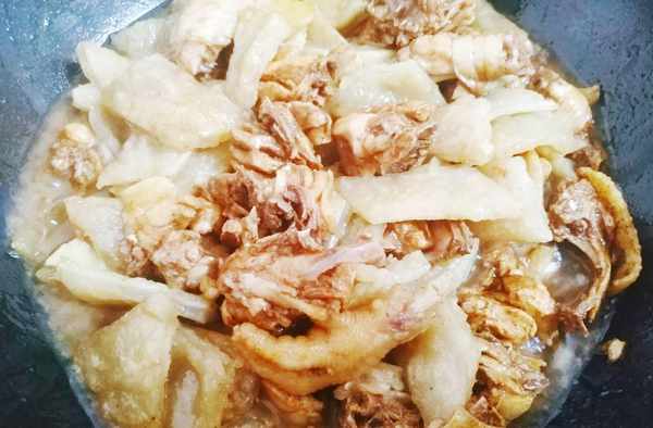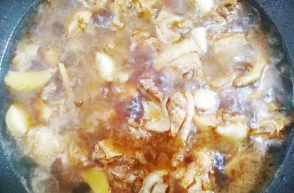 【食材準備】雞半隻、紅薯粉500克、生薑5片、料酒3勺、蒜子5個、老抽油鹽適量。
