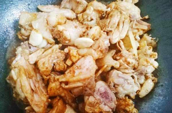第五步:熱鍋冷油(少放點油,雞出油,紅薯粉中也有油),加入雞塊煸炒1分鐘左右,加入料酒、薑片、老抽、蒜子繼續煸炒,最好是炒到雞皮出油。