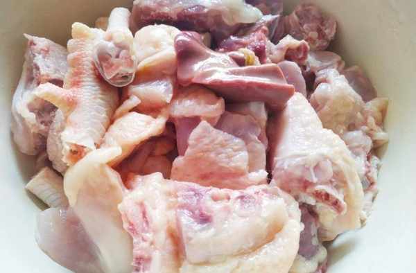 第四步:雞洗凈剁成塊狀,泡淘米水中,然後用面粉和鹽搓洗幾次洗凈備用。