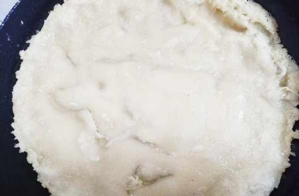 第二步:鍋中倒油,比用刷子刷的油多一點即可,倒入紅薯粉液,小火慢煎,輕輕晃動,知道成塊,然後再次澆紅薯液在上面,如此反復,直到成一個大煎餅狀。