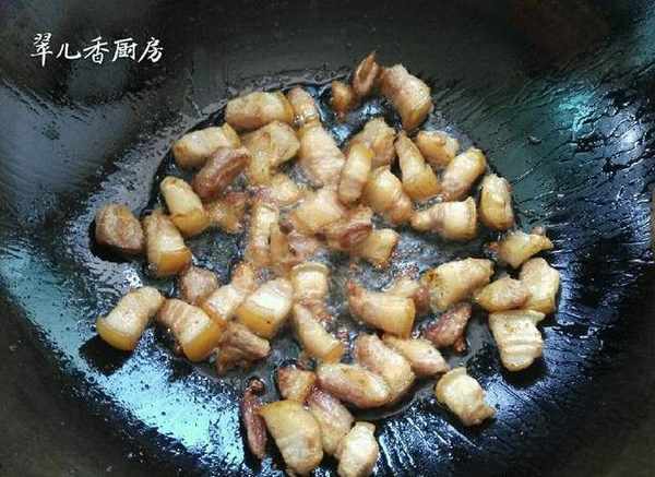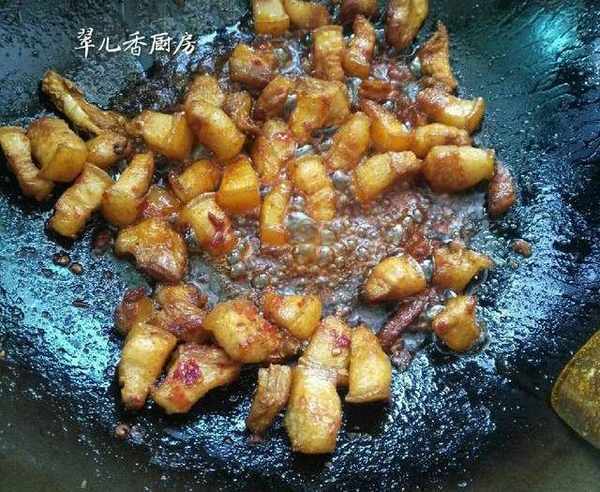 鍋內熱油,油熱後放入花椒少許,八角一顆,三奈一顆,倒入五花肉爆炒出油,待爆炒至外表色澤金黃,則放入豆瓣醬,生抽,老薑大蒜,一起爆香,此時呈焦糖色。