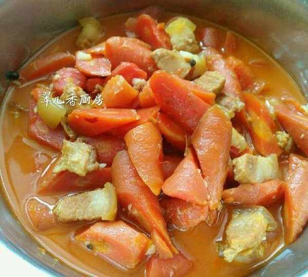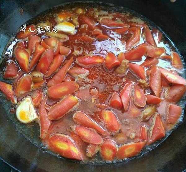 倒入紅蘿卜一起翻炒,待紅蘿卜炒熱,水分收幹時,加入開水淹沒,燒開後轉入燉鍋,燜燒至紅蘿卜和五花肉用筷子夾起熟爛為止。其實做這種燒菜並不需要太多的佐料,尤其是香料,簡單佐料燒出來的菜不僅鮮,而且最原汁原味。