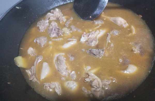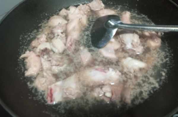 第四步爆炒鴨肉。起鍋燒油,油熱把切好的蒜米生薑片放入煸出香味,把切好的鴨肉倒入鍋中,同時用大火煸炒,把鴨肉中的水分充分炒幹出油即可。