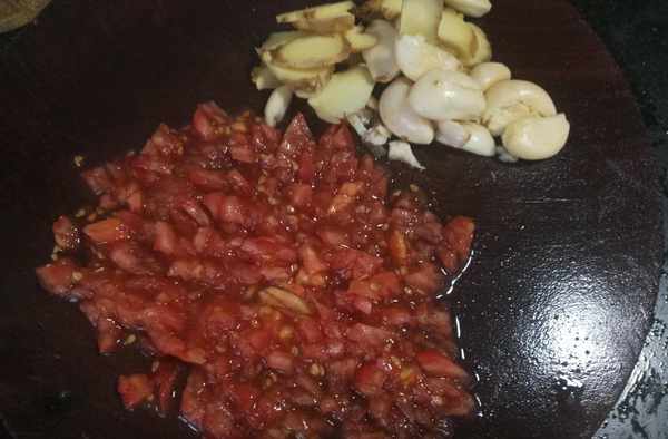 第三步準備好西紅柿和配料菜。在等待鴨肉焯水的時間裡把西紅柿清洗幹凈,削去外皮,用菜刀剁成西紅柿碎粒備用。把蒜米生薑切成小片備用。