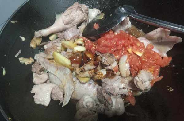 第五步鴨肉燜西紅柿。把鴨肉炒出油後,加入適量鹽、生油調味翻炒均勻,再倒入西紅柿碎粒進行翻炒,炒出西紅柿水分即可。