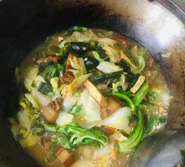 紅燒肉燴菜的版本很多,沒有固定的模式,凡是自己喜歡的菜都可以放,吃的就是一個雜亂無章,各取所長,互為補充。食材之所以雜,是上頓吃刷鍋所致,各種食材混在一起,在紅燒肉的統領下,味道是出奇的贊。