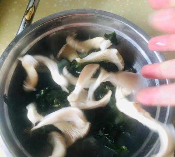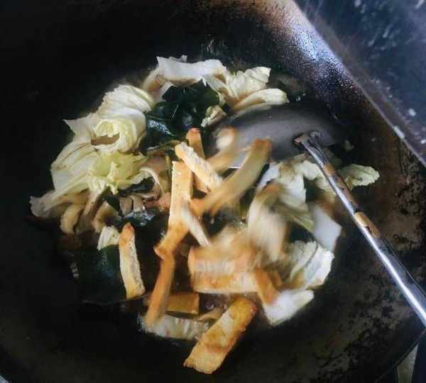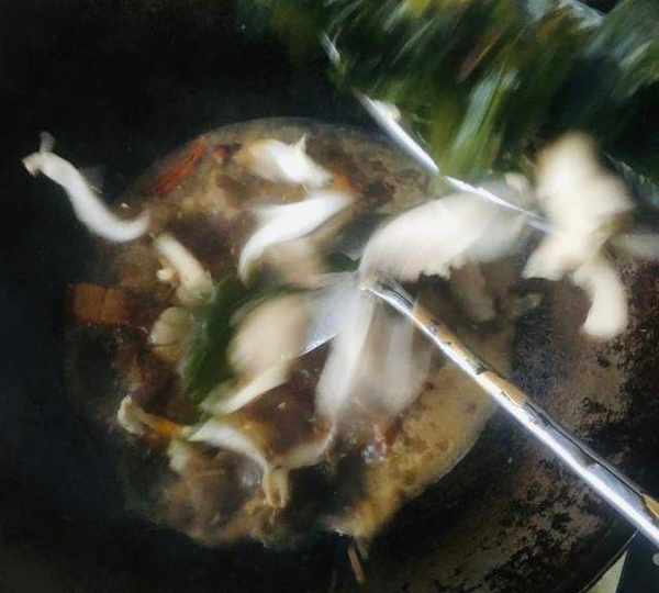 第5步、放入海帶、平菇,翻燉一會兒。