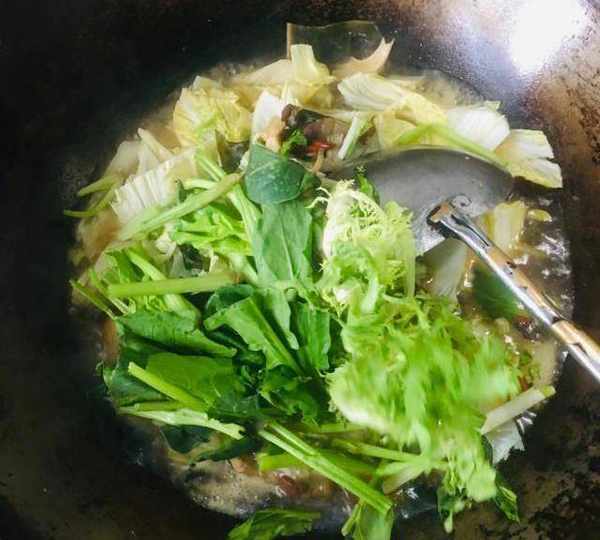 第8步、待白菜燉熟,放入菠菜、苦菊、韭菜,翻炒均勻。