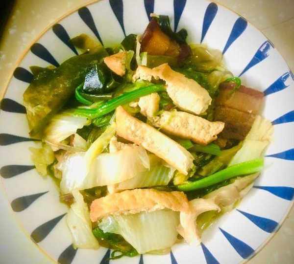 原料:紅燒肉、海帶、平菇、油炸豆腐、白菜、紅薯粉條、菠菜、苦菊、韭菜、鹽、胡椒粉、醬油、雞精。