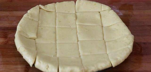 2、在案板上抹勻幹面粉,江面團揉搓上勁,再用搟面杖搟成0.5厘米厚的大餅。在大餅的表面刷一層食用油,發面兒再刷一層食用油,將面餅切成兩厘米左右的長條兒,在橫著切幾刀,在盤子底部均勻的刷食用油,將切好的面塊擺入盤中,表面再刷一層食用油,保鮮膜覆蓋餳發60分鐘。