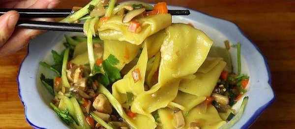 4、在案板上均勻地刷一層食用油,將面塊兒按扁後抹開成面條。起鍋燒水,等水開之後在水中加入食鹽,加入面條,煮至面條浮起呈透明色控水撈出,倒入醬汁,放入黃瓜絲,香菜末,攪拌均勻即可。