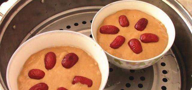 4、準備兩個無水無油的碗,裡面均勻的刷上一層油。傢裡有油紙的可以在底部鋪上一些油脂,這樣脫出來的模更容易更好看。然後倒入面糊,七分滿就行。醒發十多分鐘,感覺比之前明顯變高瞭就行啦。上層擺些去核的大棗片就可以蒸啦。水開蒸25分鐘就行瞭