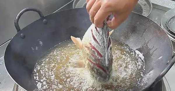 2、接著開油鍋,油溫八成熱放入鯽魚(這一步對於火候要求比較嚴格,一定要保持在高油溫,這樣炸出來才能定型成金黃),炸到鯽魚變硬倒出控油
