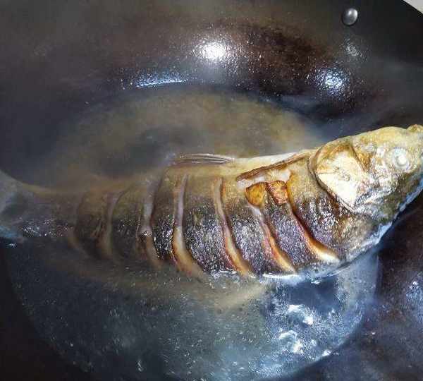 第5步、加入開水末過魚身,放入薑片蓋上蓋子大火煮。