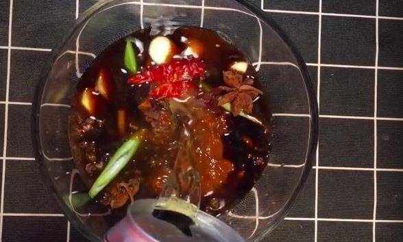 2.調制料汁碗中放入蔥薑蒜,花椒,八角,幹辣椒,一勺生抽,老抽,陳醋,鹽,十三香,一勺黃豆醬加入一罐啤酒攪拌均勻備用