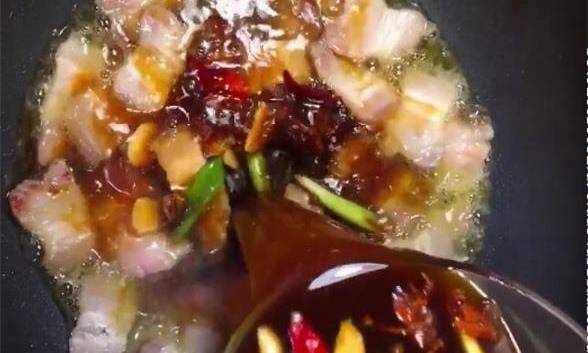3.鍋中倒入適量的食用油放入五花肉煸炒出多餘的油脂倒入提前調好的料汁大火燒開
