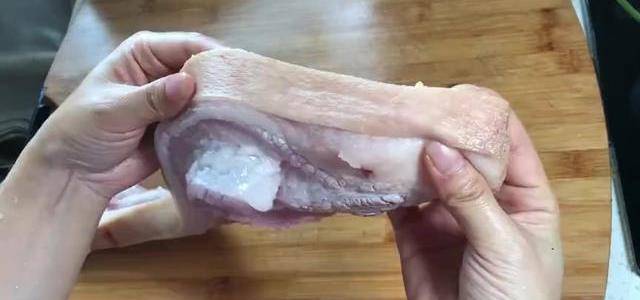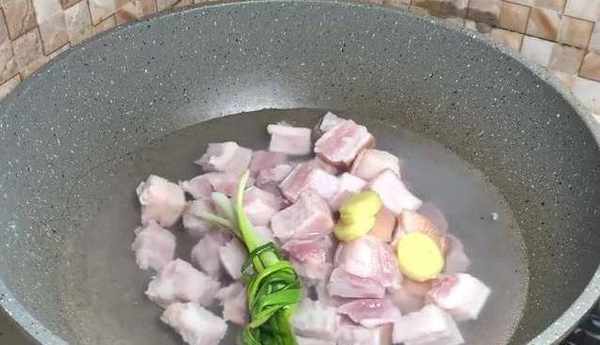 準備一塊燙瞭毛洗幹凈的五花肉將它改刀,然後切成大小均等的塊。先來把五花肉焯下水,往鍋裡倒清水,五花肉放進來,加入一個蔥節幾片生薑、少許料酒,煮開後撈出來過涼水。挑出帶肥肉的。