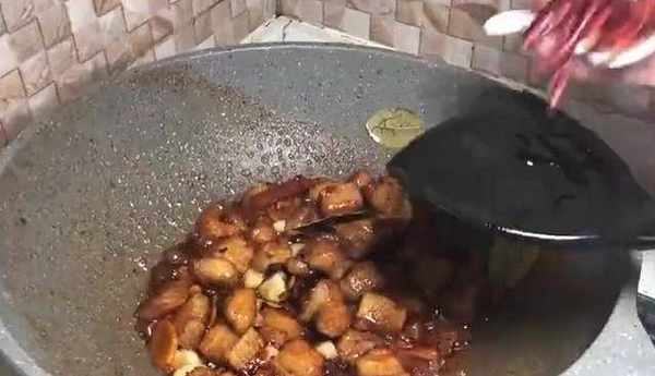 鍋裡倒油,我們先來熬一個糖色,放入一把冰糖熬制成褐色,倒入一點清水,攪動均勻後盛出來備用。鍋裡倒油。把挑出來的帶皮肥肉倒進來,煸出油後倒入剩下的瘦肉煸香。之後放入生薑片、花椒、桂皮、香葉、大蒜,把炒好的糖稀倒進來,加入蠔油,一勺豆瓣醬。再加點老抽,適量的鹽,喜歡吃辣的可以放點幹辣椒。