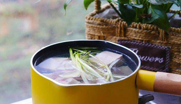 2、將處理好的五花肉冷水下鍋,同時鍋中加入蔥結、薑片,並且倒入料酒,待煮開沸騰後,將五花肉從鍋中撈出,用水洗凈,瀝幹