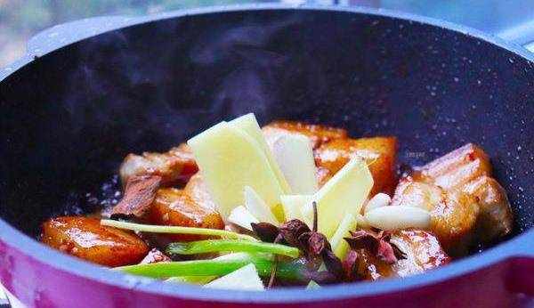 5、翻炒至五花肉上色時,在鍋中放薑蔥蒜、八角、香葉、桂皮,接著倒入沒過肉塊的溫水