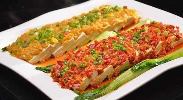 剁椒蒸豆腐:1、內酯豆腐切大片,擺入盤中,在豆腐片上鋪一層剁椒,放入蒸鍋內中火蒸5分鐘,取出倒去盤中多餘水分。