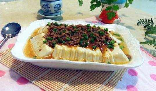 4、把肉醬鋪在一個盤子上,上面再鋪豆腐片,淋少許生抽,撒上蔥花。