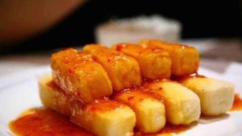 芙蓉炸豆腐:1.芙蓉豆腐每塊分別切勻成4等分,蛋打散成蛋液,白蘿卜磨成泥備用。