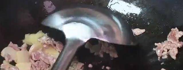 3、鍋中留底油,將薑蒜片放入鍋中爆香,再將肉片放入鍋中翻炒,放入適量的豆瓣醬,翻炒出紅油後將燙熟的香菇片放入鍋中翻炒均勻;