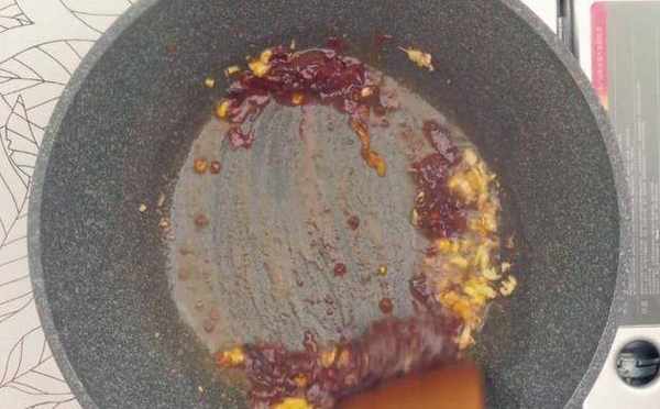 第二步:鍋中加入適量的油,三成油溫倒入薑蒜末爆香,隨後把準備好的甜辣醬,蠔油,料酒,生抽一並倒入鍋中,開大火翻炒一分鐘關火,並且適當放涼。
