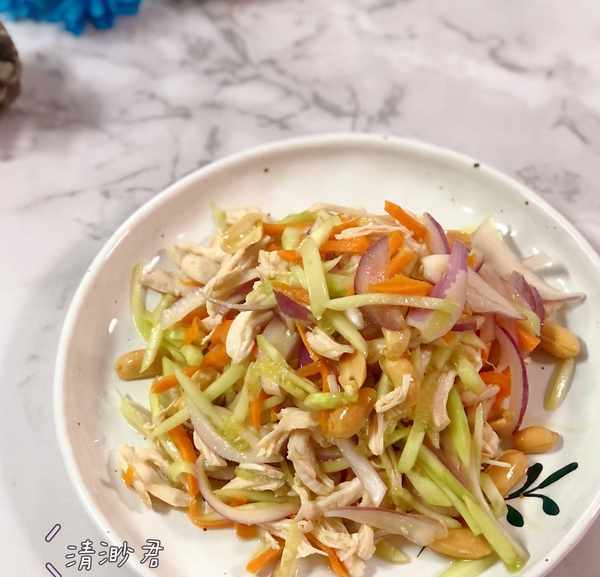 天熱就很喜歡吃黃瓜,清脆爽口,多吃也不怕發胖,且夏天易清補,雞肉含有易於消化的蛋白質,健脾,搭配蔬菜,鮮嫩不油膩。【用料】:雞小胸肉、黃瓜、胡蘿卜、洋蔥、薑、鹽、蒸魚豉油、藤椒油適量