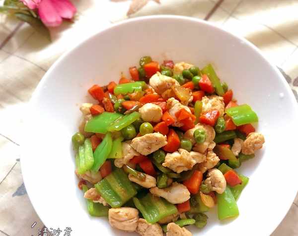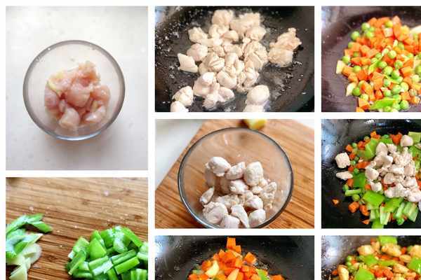 雞肉用淡鹽水洗凈,去除筋膜,切丁,用薑、白胡椒粉醃制片刻。尖椒去除根部及裡面的籽和白筋,切片;胡蘿卜去皮、切丁,豌豆洗凈後備用。熱鍋涼油,將雞丁炒至稍變色盛出,再加少許油,下入蔥、薑炒出香味。放入胡蘿卜炒至顏色略變淺,將豌豆倒入炒勻,待其表皮發皺時,分別放入尖椒、雞丁,加生抽、鹽翻炒幾下出鍋。小貼士:對雞肉腥味敏感的話,放入少許料酒去腥。