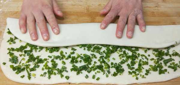 6、先從一邊折起,再把另一邊覆蓋在上面,最後切成寬約5~6厘米寬的長條