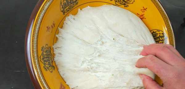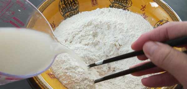 2、分次倒入500克面粉中,一邊倒一邊用筷子攪拌,攪拌成面絮狀後,再用手和成面團,然後蓋上蓋子發酵至兩倍大