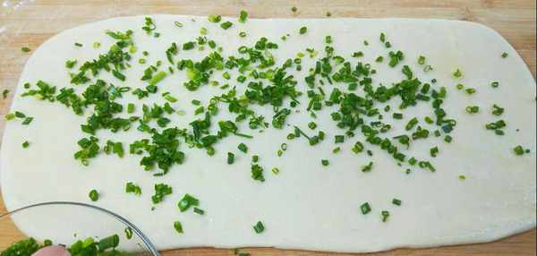 5、搟好之後在面片上均勻的刷一層油,再撒上適量的鹽,最後撒上蔥花