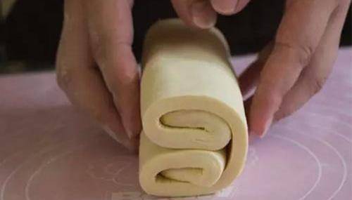 3、再從1/3處進行折疊,再折疊,疊成面塊後,再進行輕微搟制。將搟至好的面皮折疊成蝴蝶狀,放入冰箱冷藏。