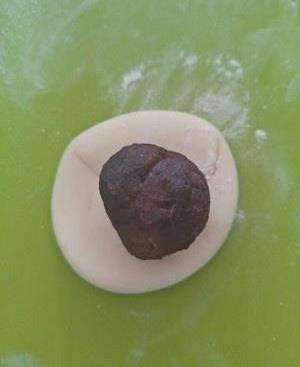 豆沙餡分成三份搓圓放入冷凍一個小時在做,把面團搓揉排氣揉光滑按扁放入豆沙餡,包裹好。