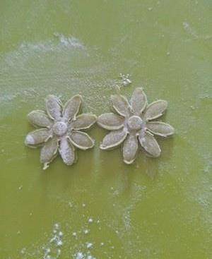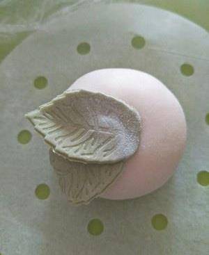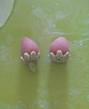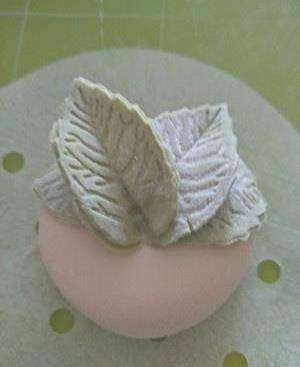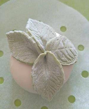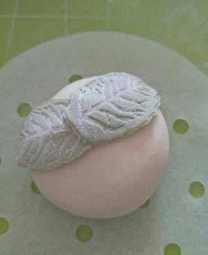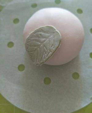 取10克綠色面團,取3克搓揉搟平用模具按壓做葉子。