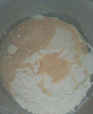 面粉和水提前放入冰箱冷藏一個小時,取出,碗裡放入水,酵母,白糖攪拌均勻倒入面粉裡。