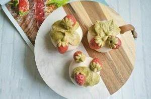 接著粘上最後兩顆草莓,第三種樣子完成,發酵好上鍋蒸13分鐘,蒸好,兩分鐘後接鍋。