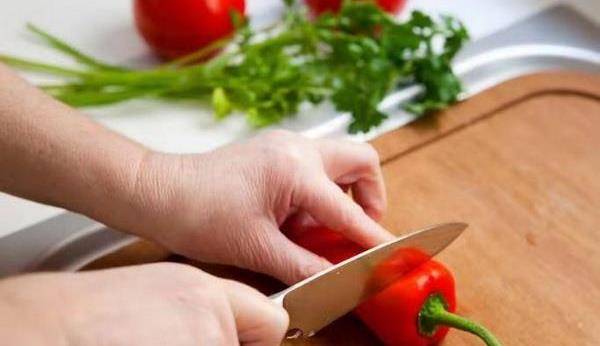 二、大紅辣椒洗幹凈之後切成辣椒段,放在一旁備用。